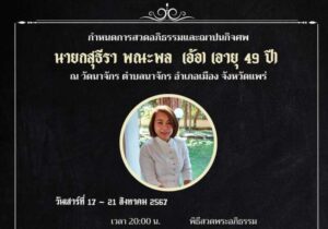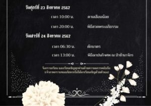 การเมืองสังคม กำหนดการสวดอธิธรรมและฌาปนกิจศพ นายกสุธีรา พณะพล(อ้อ) สิงหาคม 17, 2024 admin Facebook iconFacebookLINE iconLine Post Views: 319