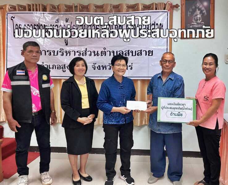 นางสาวบุษบา เดือนดาว นายกองค์การบริหารส่วนตำบลสบสาย พร้อมด้วยคณะผู้บริหารองค์การบริหารส่วนตำบลสบสาย และสมาชิกสภาหมู่ที่ 4 ตำบลสบสาย มอบเงินช่วยเหลือเยียวยาผู้ประสบอุทกภัย (น้ำท่วม)