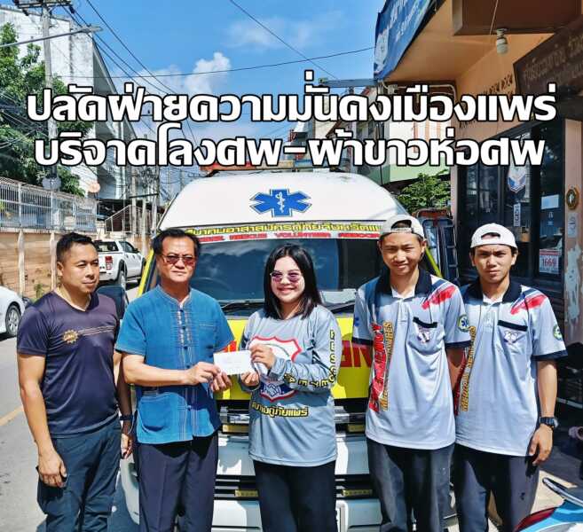 นายดำรงค์ เจริญจิตต์ ปลัดฝ่ายความมั่นคง ที่ทำการปกครองอำเภอเมืองแพร่ นายอุเทน สุขใจ เจ้าหน้าที่ปกครองอำเภอเมืองแพร่ ร่วมทำบุญบริจาคปัจจัยสนับสนุนกิจการกู้ภัยช่วยเหลือสังคมในนามส่วนตัว ด้วยการบริจาคโลงศพไห้กับผู้วายชนฆ์ที่วัดพระร่วงและทำบุญถวายปัจจัยไห้กับกู้ภัยแพร่เพื่อไปชื้อผ้าขาวห่อศพเพื่อใช้ในกิจการกู้ภัยช่วยเหลือเพื่อนมนุษย์ต่อไป