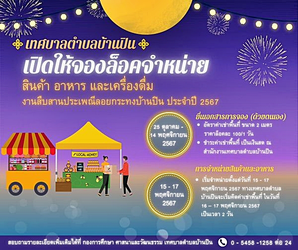 เทศบาลตำบลบ้านปิน งานกองการศึกษา ศาสนาและวัฒนธรรมเปิดให้จองล็อคจำหน่าย สินค้า อาหาร และเครื่องดื่ม ทุกประเภท ในงานสืบสานประเพณี “ลอยกระทงบ้านปิน” ประจำปี 2567 ณ บริเวณหลังสถานีรถไฟบ้านปิน ตำบลบ้านปิน ระหว่างวันที่ 15 – 17 พฤศจิกายน 2567 สามารถสอบถามรายละเอียด และยื่นเอกสารการจอง ด้วยตนเอง ได้ตั้งแต่ วันที่ 25 ตุลาคม – 14 พฤศจิกายน 2567- อัตราค่าเช่าพื้นที่ ขนาด 2 เมตร ราคาล็อคละ 100/1 วัน