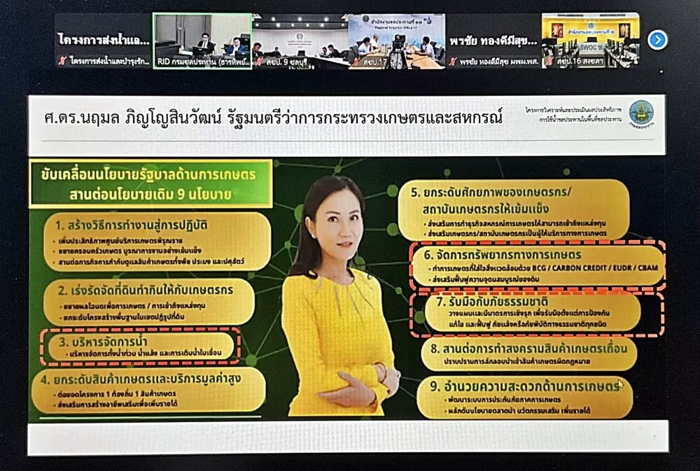 วันศุกร์ที่ 22 พฤศจิกายน 2567 เวลา 09.30 น. นายพงศ์พิษณุ ชอบประดิษฐ์ ผู้อำนวยการโครงการส่งน้ำและบำรุงรักษาแม่ยม มอบหมายให้นายธีระ นาคฉ่ำ หัวหน้าฝ่ายจัดสรรน้ำและปรับปรุงระบบชลประทาน เข้าร่วมประชุมเพื่อพิจารณาผลการวิเคราะห์และประเมินผลประสิทธิภาพการใช้น้ำชลประทานในพื้นที่ชลประทานในภาพรวมระดับกรมชลประทาน ประชุมผ่านสื่ออิเล็กทรอนิกส์ Zoom Meeting จาก ห้องประชุมธารทิพย์ 01 ชั้น 4 อาคาร 99 ปี หม่อมหลวงชูชาติ กำภู กรมชลประทาน สามเสน กรุงเทพฯ มายัง ณ ห้องฝ่ายจัดสรรน้ำและปรับปรุงระบบชลประทาน โครงการส่งน้ำและบำรุงรักษาแม่ยม ตำบลนาจักร อำเภอเมืองแพร่ จังหวัดแพร่