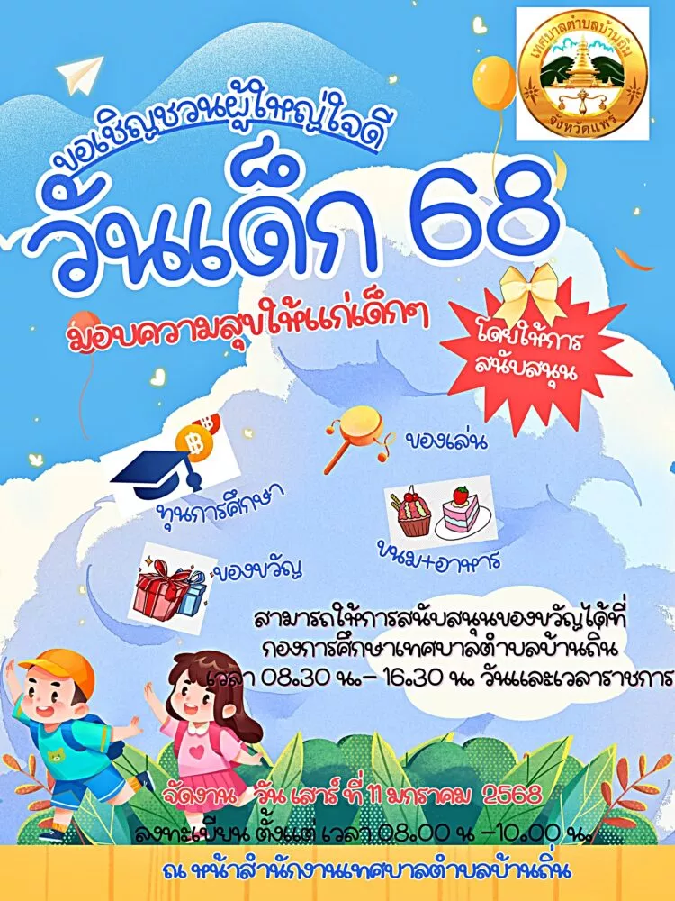 “เทศบาลตำบลบ้านถิ่น” ขอเชิญชวนผู้ใหญ่ใจดีมอบความสุขให้แก่เด็กๆโดยให้การสนับสนุน ของขวัญ ของเล่น ขนม อาหาร และทุนการศึกษา ในกิจกรรมวันเด็กแห่งชาติ ประจำปี 2568