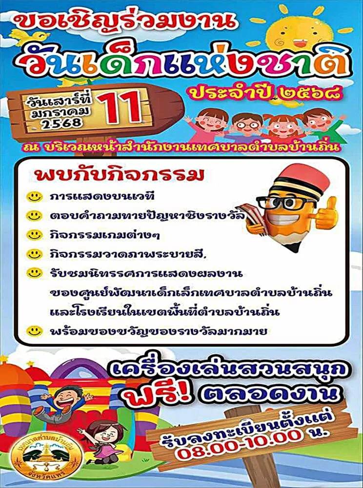 เทศบาลตำบลบ้านถิ่น ขอเชิญชวนผู้ใหญ่ใจดีมอบความสุขให้แก่เด็กๆโดยให้การสนับสนุน ของขวัญ ของเล่น ขนม อาหาร และทุนการศึกษา ในกิจกรรมวันเด็กแห่งชาติ ประจำปี 2568 โดยจัดขึ้นในวันเสาร์ที่ 11 มกราคม 2568 ณ บริเวณหน้าสำนักงานเทศบาลตำบลบ้านถิ่น
