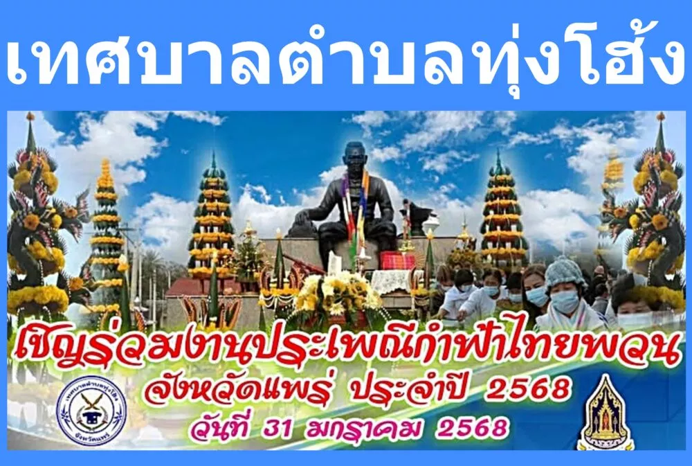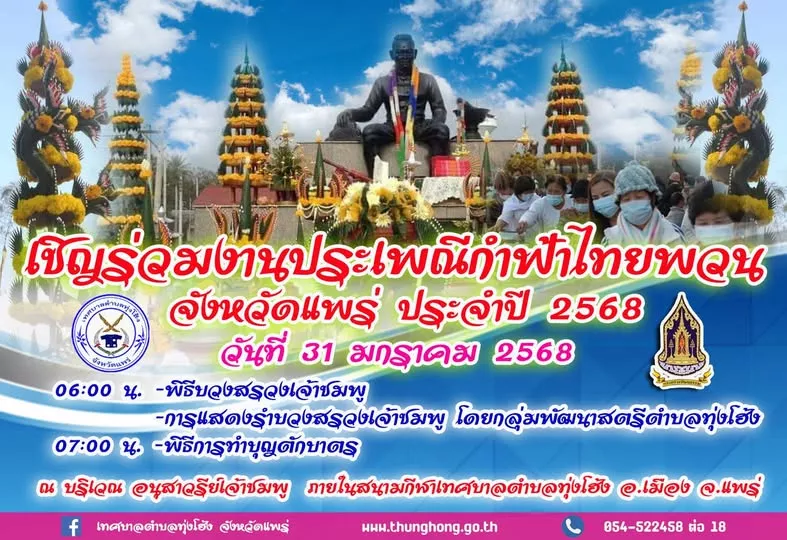 เทศบาลตำบลทุ่งโฮ้ง เชิญร่วมงานประเพณีกำฟ้าไทยพวน ประจำปี พ.ศ. ๒๕๖๘ ในวันที่ 31 มกราคม 2568 ณ ลานอนุเสาวรีย์เจ้าชมพู สนามกีฬาเทศบาลตำบลทุ่งโฮ้ง อำเภอเมืองแพร่ จังหวัดแพร่