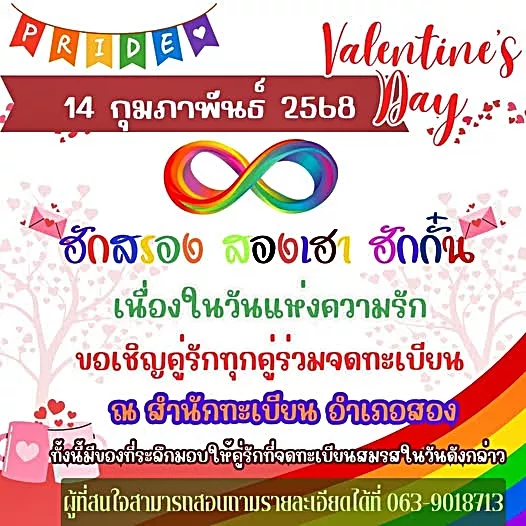 วันที่ 14 กุมภาพันธ์ 2568 เนื่องในวันแห่งความรัก ขอเชิญคู่รักทุกคู่ร่วมจดทะเบียนสมรสตามกฎหมายสมรสเท่าเทียม ณ สำนักทะเบียน อำเภอสอง จังหวัดแพร่