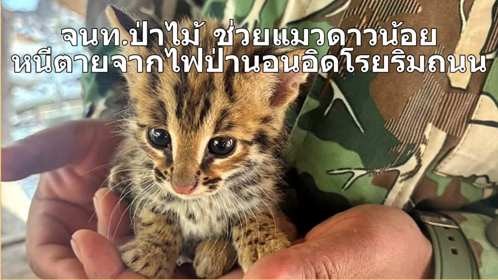 เจ้าหน้าที่ป่าไม้ช่วยแมวดาวน้อย หนีตายจากไฟป่าหมดแรงนอนอยู่ริมถนน
