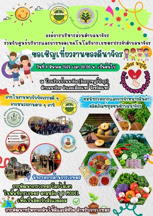 การเมืองสังคม เชิญชวนชาวตำบลนาจักร และพื้นที่ใกล้เคียง เที่ยวงานของดีนาจักร ในวันที่ 4 มีนาคม 2568 เวลา 08.00 น. เป็นต้นไป กุมภาพันธ์ 28, 2025 admin Facebook iconFacebookLINE iconLine Post Views: 434 เชิญชวนชาวตำบลนาจักร และพื้นที่ใกล้เคียง เที่ยวงานของดีนาจักร ในวันที่ 4 มีนาคม 2568 เวลา 08.00 น. เป็นต้นไป ณ โรงเรียนบ้านนาจักร (จักรราษฎร์บำรุง) พบกับ สินค้าผลิตภัณฑ์ชุมชนที่นำมาจำหน่าย และกิจกรรมดีดีจากสำนักงานเกษตรจังหวัดแพร่