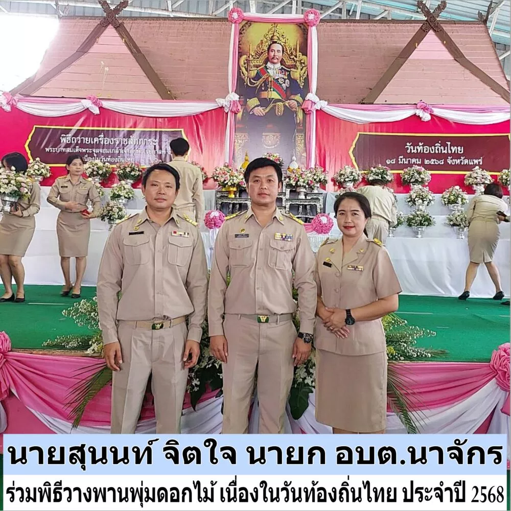 นายสุนนท์ จิตใจ นายก องค์การบริหารส่วนตำบลนาจักร และคณะฯร่วมพิธีวางพานพุ่มดอกไม้ เนื่องในวันท้องถิ่นไทย ประจำปี 2568 เพื่อรำลึกถึงพระมหากรุณาธิคุณของพระบาทสมเด็จพระจุลจอมเกล้าเจ้าอยู่หัวที่ได้ทรงมีพระบรมราชโองการให้ยกฐานะตำบลท่าฉลอมขึ้นเป็นสุขาภิบาลท่าฉลอม เมื่อวันที่ 18 มีนาคม 2448 ณ ลานวัฒนธรรมองค์การบริหารส่วนจังหวัดแพร่