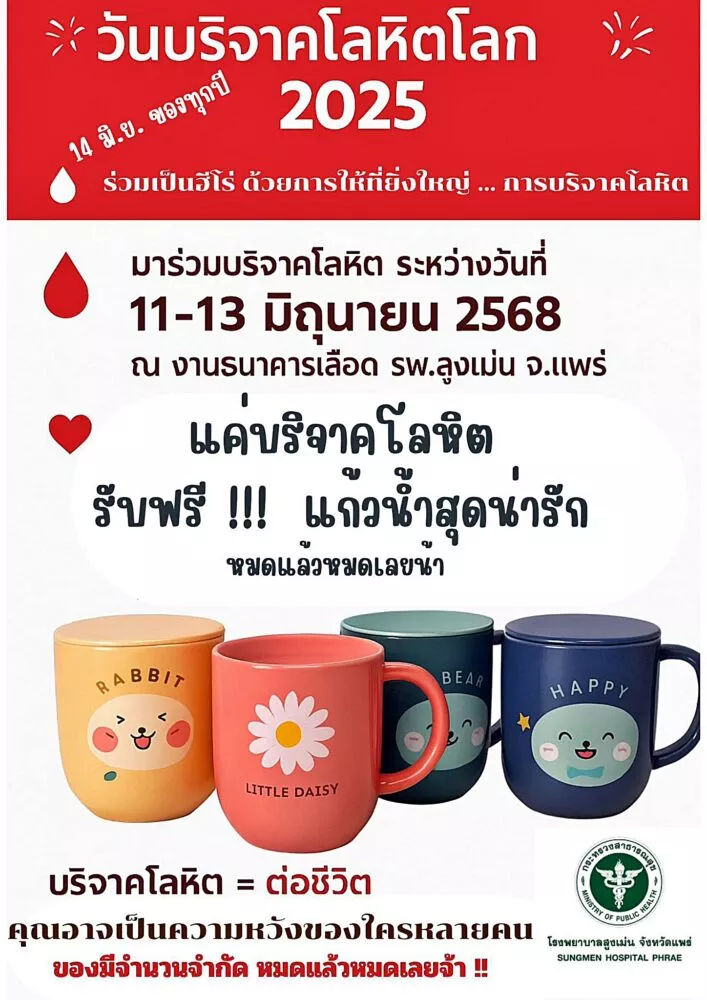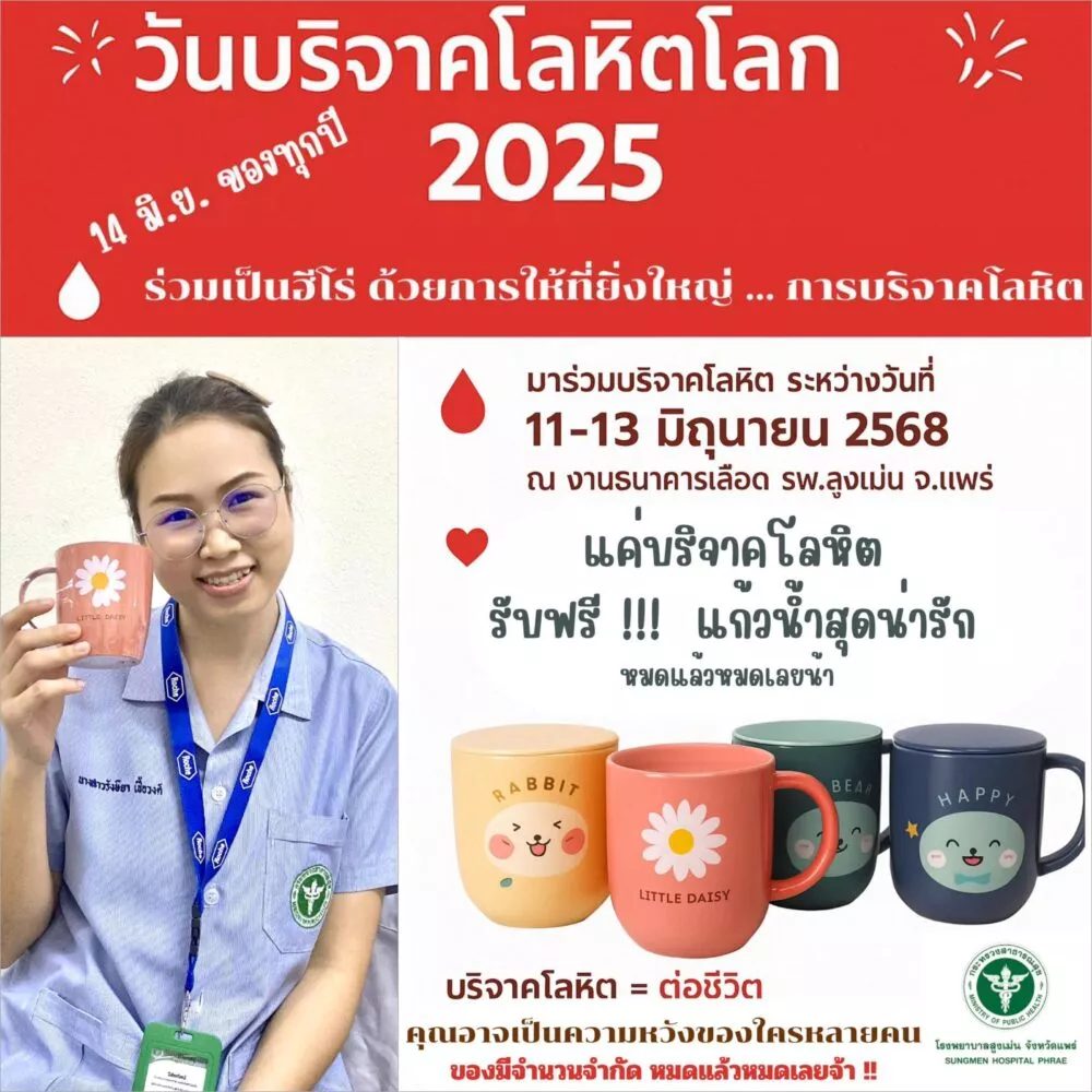 14 มิถุนายน วันบริจาคโลหิตโลก 2025 ร่วมเป็นฮีโร่ ด้วยการให้ที่ยิ่งใหญ่… “การบริจาคโลหิต” มาร่วมบริจาคโลหิต ระหว่างวันที่ 11-13 มิถุนายน 2568 ณ ห้องบริจาคโลหิต ชั้น 3 อาคารผู้ป่วยนอก รพ. สูงเม่น – แพร่ ตั้งแต่เวลา 9.00-16.00 น. ค่ะ