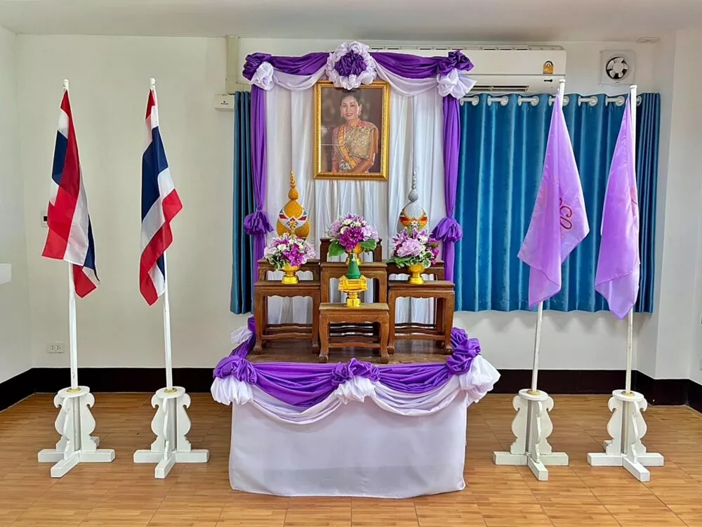 เจ้าหน้าที่โครงการส่งน้ำและบำรุงรักษาแม่ยม จัดตั้งโต๊ะหมู่ประดิษฐาน พระฉายาลักษณ์ สมเด็จพระนางเจ้าฯ พระบรมราชินี พร้อมเครื่องราชสักการะ รวมทั้งประดับผ้าสีม่วงร่วมกับผ้าระบายสีขาว และประดับธงชาติไทยร่วมกับธงอักษรพระนามาภิไธย ส.ท. ตามอาคารสถานที่ของหน่วยงาน โดยดำเนินการตลอดเดือน มิถุนายน 2568 เพื่อเป็นการแสดงความจงรักภักดีและถวายพระพรชัยมงคล เป็นไปด้วยความเรียบร้อยและสมพระเกียรติ และมอบหมายให้