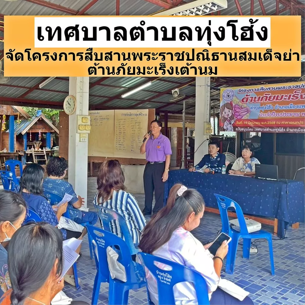 วันที่ 19 มิถุนายน 2568 นายสราวุธ หมื่นโฮ้ง นายกเทศมนตรีตำบลทุ่งโฮ้ง เป็นประธานเปิดงานโครงการสืบสานพระราชปณิธานสมเด็จย่า ต้านภัยมะเร็งเต้านม ณ ศาลาเอนกประสงค์หมู่ที่ 6 โดยมีคณะผู้บริหาร สมาชิกสภาเทศบาลตำบลทุ่งโฮ้งร่วมพบปะผู้เข้าร่วมอบรม