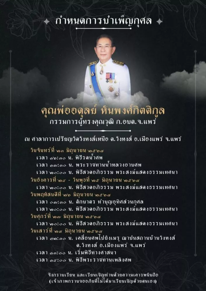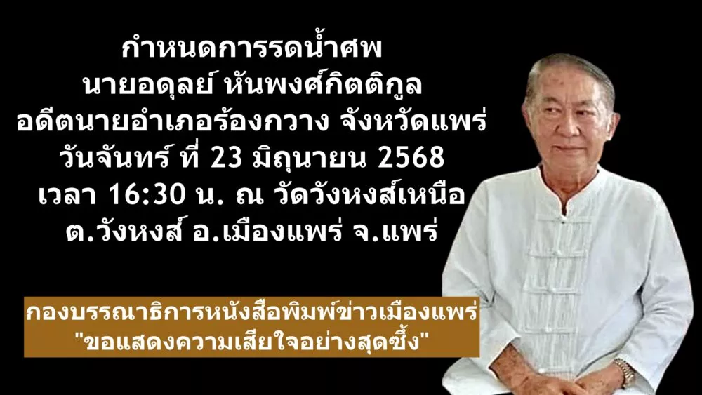 กำหนดการรดน้ำศพ “นายอดุลย์ หันพงศ์กิตติกูล” อดีตนายอำเภอร้องกวาง จังหวัดแพร่