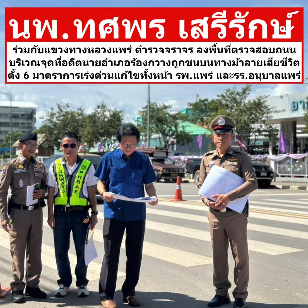 นพ.ทศพร เสรีรักษ์ ส.ส.แพร่ เขต 1 พรรคไทยรักไทย ร่วมกับ แขวงทางหลวงแพร่ และ เจ้าหน้าที่ตำรวจจราจร ลงพื้นที่สำรวจถนนหน้าโรงพยาบาลแพร่ หลังเกิดเหตุรถชนนายอำเภอร้องกวาง เสียชีวิตขณะข้ามทางมาล้าย พร้อมตั้ง 6 มาตรการเร่งด่วน แก้ไขปัญหาหารจราจร หน้าโรงพยาบาลแพร่ และโรงเรียนอนุบาลแพร่ และเตรียมเข้าพบ รมว.คมนาคมโดยเร็วเพื่อของบสนับสนุนจำนวน 9 ล้านบาท