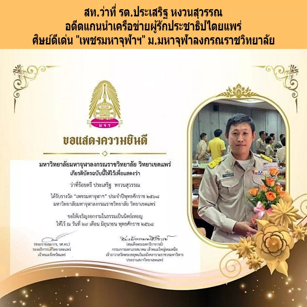 สท.ว่าที่ รต.ประเสริฐ หงวนสุวรรณ อดีตแกนนำเครือข่ายผู้รักประชาธิปไตยแพร่ ได้รับการคัดเลือกเป็นบุคลากรดีเด่น และศิษย์ดีเด่น “เพชรมหาจุฬาฯ” มหาวิทยาลัยมหาจุฬาลงกรณราชวิทยาลัย วิทยาเขตแพร่ ประจำปี ๒๕๖๘ เพื่อเป็นการยกย่องเชิดชูเกียรติศิษย์ผู้ประสบความสำเร็จในการประกอบสัมมาอาชีพเป็นที่ยอมรับโดยทั่วไปและทำคุณประโยชน์ให้แก่สังคมท้องถิ่น ประกาศเกียรติคุณต่อสาธารณชน และยกย่องเป็นต้นแบบและแรงบันดาลใจให้แก่ศิษย์ปัจจุบันในฐานะศิษย์เก่าคุณภาพของมหาวิทยาลัย