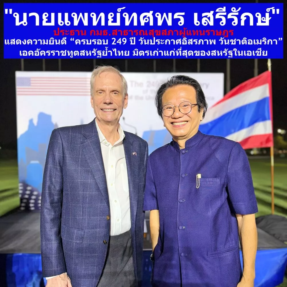การเมืองสังคม “นายแพทย์ทศพร เสรีรักษ์” ประธาน กมธ.สาธารณสุขสภาผู้แทนราษฎร ร่วมแสดงความยินดี “ครบรอบ 249 ปี วันประกาศอิสรภาพ วันชาติอเมริกา” กรกฎาคม 1, 2025 admin Facebook iconFacebookLINE iconLine Post Views: 659 “นายแพทย์ทศพร เสรีรักษ์” ประธาน กมธ.สาธารณสุขสภาผู้แทนราษฎร ร่วมแสดงความยินดี “ครบรอบ 249 ปี วันประกาศอิสรภาพ วันชาติอเมริกา”นายโรเบิร์ต เอฟ. โกเดค เอกอัครราชทูตสหรัฐประจำประเทศไทย ย้ำถึงความเป็นหุ้นส่วนกับไทย ซึ่งเป็นมิตรประเทศแรก และมิตรเก่าแก่ที่สุดของสหรัฐในเอเชีย โดยตลอดระยะเวลา 192 ปี ไทยและสหรัฐได้ยืนเคียงบ่าเคียงไหล่ทั้งในยามสงคราม การระบาดใหญ่ของโรค และการเปลี่ยนแปลงทางการเมือง ณ ท็อปกอล์ฟ เมกาซิตี้ อ.บางพลี จ.สมุทรปราการ สถานเอกอัครราชทูตสหรัฐอเมริกาประจำประเทศไทย จัดงานเลี้ยงรับรองวันประกาศอิสรภาพครบ 249 ปี โดย นายโรเบิร์ต เอฟ. โกเดค เอกอัครราชทูตสหรัฐประจำประเทศไทย ให้การต้อนรับ นายแพทย์ทศพร เสรีรักษ์ สมาชิกสภาผู้แทนราษฎรจังหวัดแพร่ ประธานกรรมาธิการสาธารณสุข สภาผู้แทนราษฎร ที่ได้ร่วมงานและแสดงความยินดี “ครบรอบ 249 ปี วันประกาศอิสรภาพ วันชาติอเมริกา” นายโรเบิร์ต เอฟ. โกเดค เอกอัครราชทูตสหรัฐประจำประเทศไทย ย้ำถึงความเป็นหุ้นส่วนกับไทย ซึ่งเป็นมิตรประเทศแรก และมิตรเก่าแก่ที่สุดของสหรัฐในเอเชีย โดยตลอดระยะเวลา 192 ปี ไทยและสหรัฐได้ยืนเคียงบ่าเคียงไหล่ทั้งในยามสงคราม การระบาดใหญ่ของโรค และการเปลี่ยนแปลงทางการเมือง นายโกเดค ยืนยันอีกว่า สหรัฐพร้อมให้ความสนับสนุนรัฐบาลไทย ในการแก้ไขและปราบปรามอาชญากรรมออนไลน์ และกล่าวถึงการเจรจาการค้าระหว่างสหรัฐกับไทย ว่าอยู่ระหว่างดำเนินการ และกล่าวถึงสถานการณ์ชายแดนระหว่างไทยกับกัมพูชา ว่าสหรัฐติดตามสถานการณ์อย่างใกล้ชิด และขอให้ทั้งสองประเทศร่วมกันหาทางออกอย่างสันติวิธี โดยอยู่บนพื้นฐานทางการทูตเป็นหลัก.