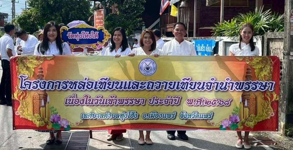 นายสราวุธ หมื่นโฮ้ง นายกเทศมนตรีตำบลทุ่งโฮ้ง พร้อมด้วยคณะผู้บริหาร สมาชิกสภาเทศบาลฯ ข้าราชการ เจ้าหน้าที่พนักงานเทศบาลตำบลทุ่งโฮ้ง กำนัน ผู้ใหญ่บ้าน คณะกรรมการชุมชน กลุ่มพัฒนาสตรีตำบลทุ่งโฮ้ง ชมรมไทยพวนจังหวัดแพร่ ชมรมผู้สูงอายุตำบลทุ่งโฮ้ง ชมรมข้าราชการบำนาญตำบลทุ่งโฮ้ง และประชาชนทั่วไป เข้าร่วมกิจกรรมแห่เทียนและถวายเทียนจำนำพรรษา เนื่องในวันเข้าพรรษา ประจำปี 2568 ณ วัดทุ่งโฮ้งเหนือและวัดทุ่งโฮ้งใต้ อำเภอเมืองแพร่ จังหวัดแพร่