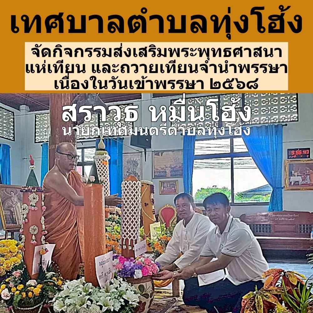 วันพุธ ที่ 9 กรกฎาคม 2568 เวลา 09.00 น. นายสราวุธ หมื่นโฮ้ง นายกเทศมนตรีตำบลทุ่งโฮ้ง พร้อมด้วยคณะผู้บริหาร สมาชิกสภาเทศบาลฯ ข้าราชการ เจ้าหน้าที่พนักงานเทศบาลตำบลทุ่งโฮ้ง กำนัน ผู้ใหญ่บ้าน คณะกรรมการชุมชน กลุ่มพัฒนาสตรีตำบลทุ่งโฮ้ง ชมรมไทยพวนจังหวัดแพร่ ชมรมผู้สูงอายุตำบลทุ่งโฮ้ง ชมรมข้าราชการบำนาญตำบลทุ่งโฮ้ง และประชาชนทั่วไป เข้าร่วมกิจกรรมแห่เทียนและถวายเทียนจำนำพรรษา เนื่องในวันเข้าพรรษา ประจำปี 2568 ณ วัดทุ่งโฮ้งเหนือและวัดทุ่งโฮ้งใต้ โดยกิจกรรมทั้งหมดนี้เป็นการส่งเสริม สืบสาน และอนุรักษ์ประเพณีวัฒนธรรมของท้องถิ่น ส่งเสริมให้ประชาชนในชุมชนได้ทำกิจกรรมร่วมกัน ตลอดจนเกิดความร่วมแรงร่วมใจและความสมัครสมานสามัคคี