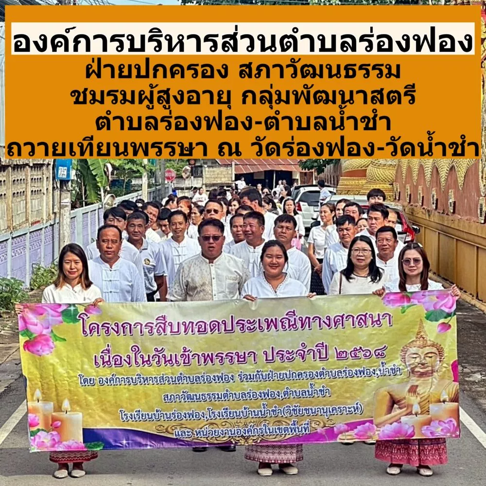 วันที่ ๙ กรกฎาคม ๒๕๖๘ นายชัยตุรงค์ วงศ์ศักดิ์สิทธิ์ นายกองค์การบริหารส่วนตำบลร่องฟอง พร้อมคณะผู้บริหาร ส.อบต. หัวหน้าส่วนข้าราชการและพนักงาน องค์การบริหารส่วนตำบลร่องฟอง ร่วมกับ ฝ่ายปกครองตำบลร่องฟอง ฝ่ายปกครองตำบลน้ำชำ สภาวัฒนธรรมตำบลร่องฟอง สภาวัฒนธรรมตำบลน้ำชำ ชมรมผู้สูงอายุ และกลุ่มพัฒนาสตรีตำบลร่องฟอง ถวายเทียนพรรษา ประจำปี ๒๕๖๘ ณ วัดร่องฟอง และ วัดน้ำชำ เพื่อสืบสานและส่งเสริมประเพณีทางศาสนา เนื่องในวันเข้าพรรษา ประจำปี ๒๕๖๘