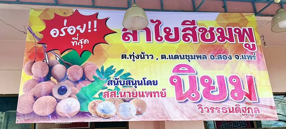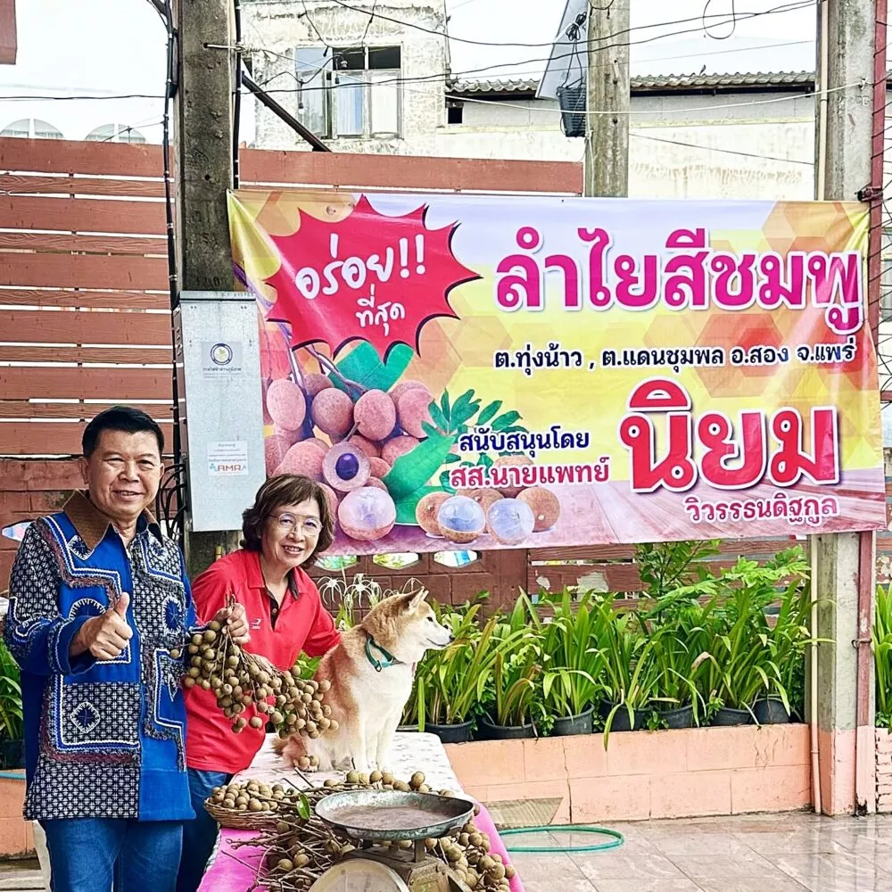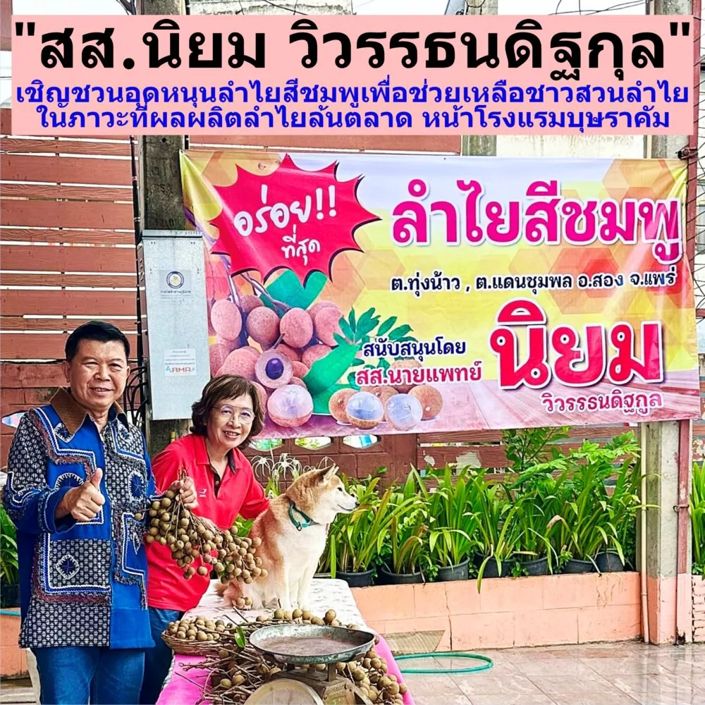 “สส.นิยม วิวรรธนดิฐกุล”เชิญชวนอุดหนุนลำไยสีชมพู สดๆจากสวน เพื่อช่วยเหลือชาวสวนลำไย ในภาวะที่ผลผลิตลำไยล้นตลาด เพื่อบรรเทาความเดือดร้อนของเกษตรกร ราคาขายเท่าหน้าสวน ราคากิโลละ 30-35 บาท มีจำนวน 500 กว่ากิโล จำหน่ายหน้าโรงแรมบุษราคัม ข้าง โรงเรียนวัดเมธังกราวาส ตำบลในเวียง อำเภอเมืองแพร่ จังหวัดแพร่ โทรฯ 054-511437