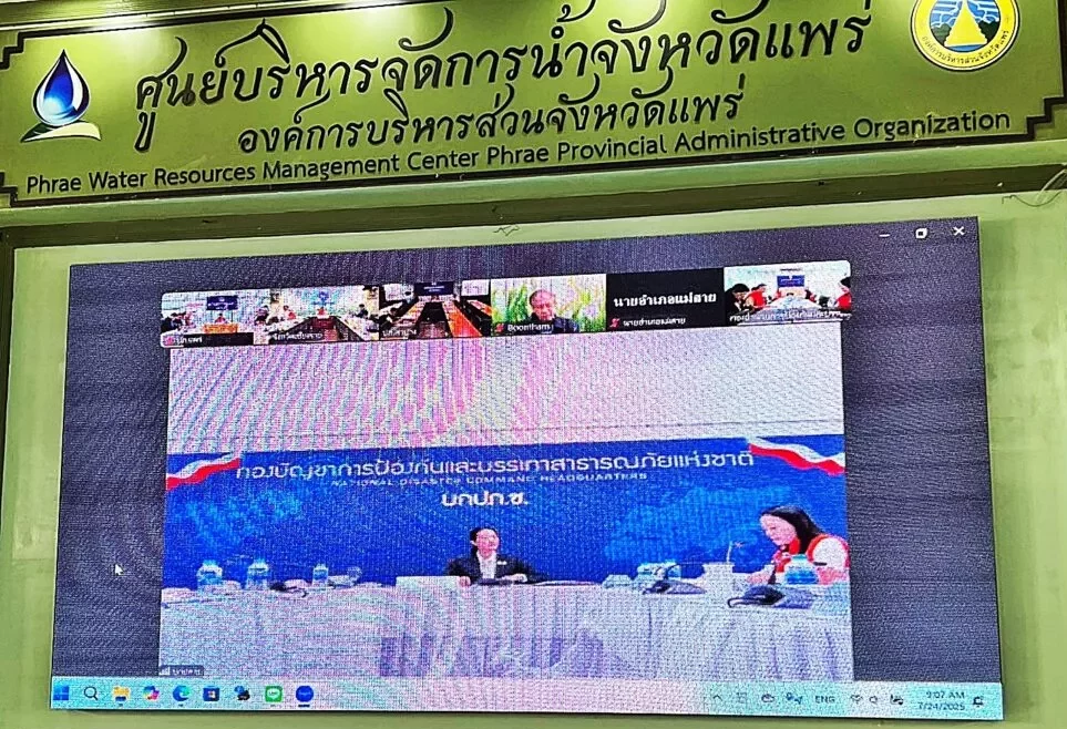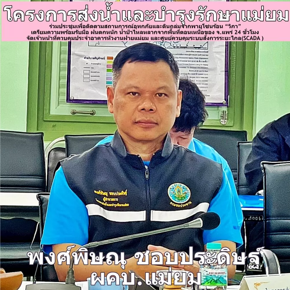 วันพฤหัสบดีที่ 24 กรกฎาคม 2568 เวลา 09.00 น. นายพงศ์พิษณุ ชอบประดิษฐ์ ผู้อำนวยการโครงการส่งน้ำและบำรุงรักษาแม่ยม เข้าร่วมประชุมเพื่อติดตามสถานการณ์อุทกภัยและดินถล่ม จากอิทธิพลของพายุโซนร้อน “วิภา” พร้อมด้วยนายสมชัย เลิศประสิทธิพันธ์ ผู้ว่าราชการจังหวัดแพร่ ร่วมประชุมผ่านสื่ออิเล็กทรอนิกส์ จาก ห้อง Wor room ชั้น 2 ศาลาว่าการกระทรวงมหาดไทย มายัง ณ ห้องประชุมศูนย์บริหารจัดการน้ำจังหวัดแพร่ ชั้น 2 องค์การบริหารส่วนจังหวัดแพร่ (กอเปา) ตำบลทุ่งโฮ้ง อำเภอเมืองแพร่ จังหวัดแพร่ โดยมีนางสาวธีรรัตน์ สำเร็จวาณิชย์ รัฐมนตรีช่วยว่าการกระทรวงมหาดไทย เป็นประธานการประชุมฯ