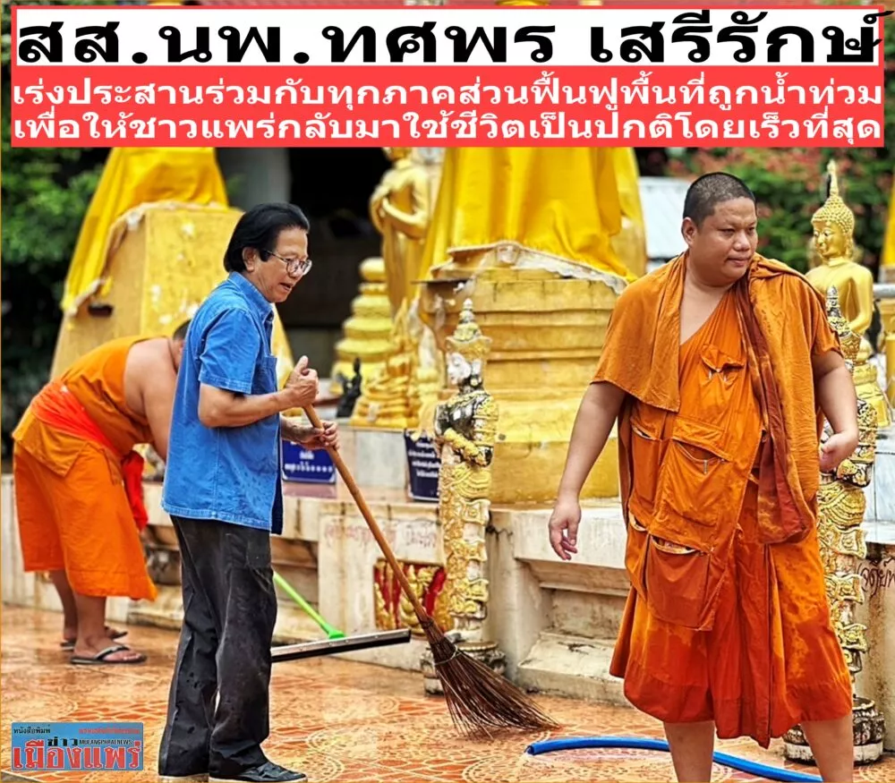 การเมืองสังคม “สส.นพ.ทศพร เสรีรักษ์” เร่งประสานร่วมกับทุกภาคส่วนฟื้นฟูพื้นที่ประสบอุทกภัย เพื่อให้ชาวแพร่กลับมาใช้ชีวิตเป็นปกติโดยเร็วที่สุด กรกฎาคม 28, 2025 admin Facebook iconFacebookLINE iconLine Post Views: 680 “นพ.ทศพร เสรีรักษ์” สมาชิกสภาผู้แทนราษฎรจังหวัดแพร่ ลงพื้นที่ร่วมกับ หน่วยงานราชการ องค์กรปกครองส่วนท้องถิ่น ผู้นำท้องถิ่น ผู้นำท้องที่ องค์กรภาคประชาชน นำรถดับเพลิง อุปกรณ์ชำระล้างเศษสวะออกจากสถานที่ราชการ อาคารบ้านเรือนที่ประสบอุทกภัย เพื่อให้ชาวแพร่กลับมาใช้ชีวิตปกติโดยเร็วที่สุด ผู้สื่อข่าวรายงานว่า เมือวันที่ 28 กรกฎาคม 2568 นพ.ทศพร เสรีรักษ์ สมาชิกสภาผู้แทนราษฎรจังหวัดแพร่ ได้ลงพื้นที่ร่วมกับทุกภาคส่วนในการติดตามและเร่งให้ความช่วยเหลือพี่น้องประชาชน ที่ประสบอุทกภัยจากพายุโซนร้อน”วิภา” ช่วงเช้าตรู่วันนี้ สส.นพ.ทศพร เสรีรักษ์ ได้เดินทางไปยังพื้นที่ ตำบลสบสาย อำเภอสูงเม่น จังหวัดแพร่ เพื่อร่วมกับทุกภาคส่วนเพื่อร่วมล้างทำความสะอาดวัดสบสาย โรงพยาบาลส่งเสริมสุขภาพตำบลสบสาย และโรงเรียนผู้สูงอายุตำบลสบสาย ต่อจากนั้นจากนั้นได้เดินทางไปที่ โรงเรียนเมธังกราวาส ตำบลในเวียง อำเภอเมืองแพร่ จังหวัดแพร่ ได้ร่วมกับคณะครู ผู้ปกครอง และเจ้าหน้าที่ร่วมกันทำความสะอาด เสร็จแล้ว สส.นพ.ทศพร เสรีรักษ์ เดินทางไปที่ วัดเชตวัน ตำบลในเวียง อำเภอเมืองแพร่ จังหวัดแพร่ เพื่อร่วมกับเจ้าอาวาสและพระสงฆ์ได้ช่วยกันล้างเก็บกวาดวัดด้วยตนเอง โดยได้รับการสนับสนุนจากเจ้าหน้าที่อุทยานแห่งชาตินาตอง แม่สายแม่ก๋อน ที่นำอุปกรณ์และกำลังคนเข้าร่วมภารกิจครั้งนี้ด้วย ช่วงบ่าย สส.นพ.ทศพร เสรีรักษ์ ได้เดินทางต่อไปยัง ชุมชนวัดสวรรค์นิเวศน์ ตำบลในเวียง อำเภอเมืองแพร่ จังหวัดแพร่ ซึ่งเป็นพื้นที่ได้รับผลกระทบอย่างรุนแรงจากอุทกภัย โดยได้ร่วมกับเจ้าหน้าที่ทหารจากมณฑลทหารบกที่ 35 ที่นำกำลังมาช่วยชะล้างถนนและบ้านเรือนราษฎรในพื้นที่ สส.นพ.ทศพร เสรีรักษ์ ได้เปิดเผยถึงภารกิจที่ได้ลงพื้นที่ให้ความช่วยเหลือพี่น้องประชาชนที่ถูกน้ำท่วมในวันนี้ว่า ขณะที่ในแต่ละพื้นที่ชุมชนหมู่บ้านที่ได้รับผลกระทบจากอุทกภัยได้มีประสานรถน้ำจากองค์การบริหารส่วนจังหวัดแพร่ เทศบาลเมืองแพร่ องค์การบริหารส่วนตำบล และเทศบาลตำบลในพื้นที่จังหวัดแพร่ ในการนำรถ อุปกรณ์ทำความสะอาดเข้าชะล้างอาคารบ้านเรือน ที่ได้รับผลกระทบเพราะหลังจากระดับน้ำลดลงไปแล้วยัง มีโคลน เศษหินดินทราย เศษสวะต่างๆที่ได้ไหลมากับน้ำและยังตกคั่งค้างอยู่ในอาคารบ้านเรือนเป็นจำนวนมาก แม้ว่าส