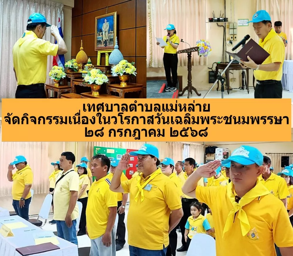 วันอังคารที่ ๒๙ กรกฏาคม ๒๕๖๘ เทศบาลตำบลแม่หล่าย จัดกิจกรรมเฉลิมพระเกียรติพระบาทสมเด็จพระเจ้าอยู่หัว เนื่องในวโรกาสวันเฉลิมพระชนมพรรษา ๒๘ กรกฎาคม ๒๕๖๘ ณ ห้องประชุมเทศบาลตำบลแม่หล่าย เพื่อให้ผู้นำท้องถิ่น ท้องที่ สมาชิกสภาเทศบาล เจ้าหน้าที่ พนักงานจ้างและประชาชนได้แสดงออกถึงความจงรักภักดี และสำนึกในพระมหากรุณาธิคุณ ด้วยกิจกรรมบำเพ็ญประโยชน์ร่วมกัน