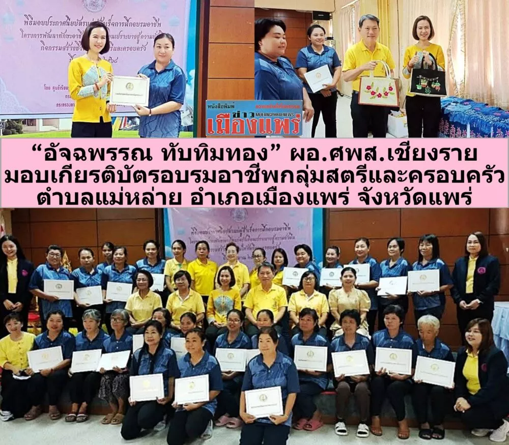 ข่าวทั่วไป “อัจฉพรรณ ทับทิมทอง” ผอ.ศพส.เชียงราย มอบเกียรติบัตร”การฝึกอบรมอาชีพ กิจกรรมสร้างชีวิตใหม่ให้สตรีและครอบครัว”ต.แม่หล่าย อ.เมือง จ.แพร่ กรกฎาคม 31, 2025 admin Facebook iconFacebookLINE iconLine Post Views: 727 “อัจฉพรรณ ทับทิมทอง” นางสาวอัจฉพรรณ ทับทิมทอง ผู้อำนวยการศูนย์เรียนรู้การพัฒนาสตรีและครอบครัว จังหวัดเชียงราย ได้เป็นประธานในพิธีมอบประกาศนียบัตรแก่ผู้สำเร็จ”การฝึกอบรมอาชีพ กิจกรรมสร้างชีวิตใหม่ให้สตรีและครอบครัว” มี นายบรรจง ยัพวัฒนา นายกเทศมนตรีตำบลแม่หล่าย พร้อมด้วยคณะผู้บริหาร หัวหน้าสำนักปลัดเทศบาล นักพัฒนาชุมชน และสมาชิกสภาเทศบาลตำบลแม่หล่าย ร่วมเป็นเกียรติในพิธีมอบ ณ ห้องประชุมเทศบาลตำบลแม่หล่าย อำเภอเมืองแพร่ จังหวัดแพร่ เมื่อวันที่ 30 กรกฎาคม 2568 เวลา 10.30 นางสาวอัจฉพรรณ ทับทิมทอง ผู้อำนวยการศูนย์เรียนรู้การพัฒนาสตรีและครอบครัว จังหวัดเชียงราย ได้เป็นประธานในพิธีมอบประกาศนียบัตรแก่ผู้สำเร็จ”การฝึกอบรมอาชีพ กิจกรรมสร้างชีวิตใหม่ให้สตรีและครอบครัว “ ณ ห้องประชุมเทศบาลตำบลแม่หล่าย โดยมี นายบรรจง ยัพวัฒนา นายกเทศมนตรีตำบลแม่หล่าย พร้อมด้วยคณะผู้บริหาร หัวหน้าสำนักปลัดเทศบาล นักพัฒนาชุมชน และสมาชิกสภาเทศบาลตำบลแม่หล่าย ให้การต้อนรับ และภาคส่วนที่เกี่ยวข้องให้เกียรติร่วมพิธี ตามที่ศูนย์เรียนรู้การพัฒนาสตรีและครอบครัว จังหวัดเชียงราย สังกัด กรมกิจการสตรีและสถาบันครอบครัว กระทรวงการพัฒนาสังคมและความมั่นคงของมนุษย์ ได้ดำเนินการจัดฝึกอบรมอาชีพ ภายใต้กิจกรรมสร้างชีวิตใหม่ให้สตรีและครอบครัว หลักสูตรผ้าพันคอย้อมคราม ให้แก่กลุ่มสตรีในพื้นที่ตำบลแม่หล่าย จำนวน 1 กลุ่ม ได้แก่ กลุ่มสตรีบ้านบุญเจริญ ตำบลแม่หล่าย อำเภอเมืองแพร่ จังหวัดแพร่ ระหว่างวันที่ 16 มกราคม 2568-7 กุมภาพันธ์ 2568 ที่ได้เสร็จสิ้นไปแล้วนั้น นางสาวอัจฉพรรณ ทับทิมทอง ผู้อำนวยการศูนย์เรียนรู้การพัฒนาสตรีและครอบครัว จังหวัดเชียงราย ได้เป็นประธานในพิธีมอบประกาศนียบัตรแก่ผู้สำเร็จการฝึกการอบรม และได้กล่าวว่า “การฝึกอบรมอาชีพ กิจกรรมสร้างชีวิตใหม่ให้สตรีและครอบครัว “ ที่ดังกล่าวนี้เพื่อเป็นการช่วยเหลือสตรีและครอบครัว ที่ต้องเผชิญปัญหาและความท้าทายต่าง ๆ โดยมีเป้าหมายเพื่อสร้างชีวิตใหม่ที่ดีขึ้น และยั่งยืนให้แก่กลุ่มสตรีตามที่ได้กล่าวมาข้างต้นนี้ ศูนย์เรียนรู้การพัฒนาสตรีและครอบครัวจังหวัดเชียงราย ขอขอบคุณ นายบรรจง ยัพวัฒนา นายกเทศมนตรีตำบลแม่หล่าย พร้อมด้วยคณะผู้บริหาร หัวหน้าสำนักปลัดเทศบาล นักพัฒนาชุมชน และสมาชิกสภาเทศบ