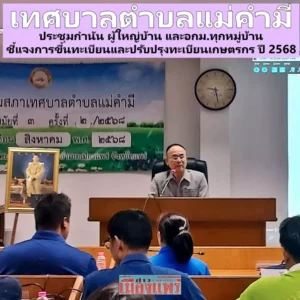 วันที่ 11 กันยายน 2568 เวลา 09.30 น. นางสร้อยทอง หล้าคำมี นายกเทศมนตรีตำบลแม่คำมี มอบหมายให้ ร.ต.อ.กิตติพงศ์ เจริญกิจวัฒนากุล รองนายกเทศมนตรีตำบลแม่คำมี เข้าร่วมประชุมคณะทำงานตรวจสอบการขึ้นทะเบียนเกษตรกร ระดับหมู่บ้าน เพื่อชี้เเจงแนวทางการขึ้นทะเบียนและปรับปรุงทะเบียนเกษตรกร ปี 2568 และการรับขึ้นทะเบียนเกษตรกร/รับแจ้งปรับปรุงข้อมูลทะเบียนเกษตรกรของพื้นที่ตำบลแม่คำมี กับเจ้าหน้าที่สำนักงานเกษตรอำเภอเมืองแพร่ โดยมีกำนัน ผู้ใหญ่บ้าน และอกม.ทุกหมู่บ้านในตำบลแม่คำมีเข้าร่วมการประชุมในครั้งนี้