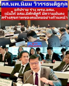 การเมืองสังคม สส.นพ.นิยม วิวรรธนดิฐกุล อภิปราย ร่าง พรบ.อสม.เน้นให้ อสม.มีศักดิ์ศรี มีความมั่นคง สร้างคุณูปการให้กับสุขภาพของคนไทยอย่างถ้วนหน้าและยั่งยืนตลอดไป กันยายน 24, 2025 admin Facebook iconFacebookLINE iconLine Post Views: 514 สส.นพ.นิยม วิวรรธนดิฐกุล อภิปราย ร่าง พรบ.อสม. เน้นให้ อสม.มีศักดิ์ศรี มีความมั่นคงและสร้างคุณูปการให้กับสุขภาพของคนไทยอย่างถ้วนหน้าและยั่งยืนตลอดไป วันพุธที่ 24 กันยายน 2568 ที่อาคารรัฐสภา มีการประชุมของคณะกรรมาธิการวิสามัญพิจารณา ร่างพระราชบัญญัติอาสาสมัครสาธารณสุขประจำหมู่บ้าน(อสม.)โดยมี นายสมศักดิ์ เทพสุทิน รักษาการรัฐมนตรีว่าการกระทรวงสาธารณสุข เป็นประธาน และมี คณะกรรมาธิการ คณะที่ปรึกษา,เจ้าหน้าที่ของสำนักงบประมาณ ,กฤษฎีกา,ตัวแทน อสม.และหน่วยงานอื่นๆที่เกี่ยวข้อง เข้าร่วมประชุม ในที่ประชุม สส.นายแพทย์นิยม วิวรรธนดิฐกุล ในฐานะกรรมาธิการและที่ปรึกษา ได้เข้าร่วมประชุม เกือบ 8 ชั่วโมง ตั้งแต่ 9.30 น. ถึง 17.00 น. และได้อภิปรายแสดงความคิดเห็นและข้อเสนอแนะต่างๆให้กับที่ประชุมกรรมาธิการ ที่เป็นประโยชน์ต่อพี่น้องประชาชน และ อสม. การอภิปรายได้เน้นการบูรณาการของหน่วยงานราชการ องค์กรปกครองส่วนท้องถิ่น อสม.และประชาชน โดยมีเป้าหมายให้ อสม.เป็นอาสาสมัครที่มีศักดิ์ศรี มีความมั่นคง และสร้างคุณูปการให้กับสุขภาพของคนไทยอย่างถ้วนหน้าและยั่งยืนต่อไป