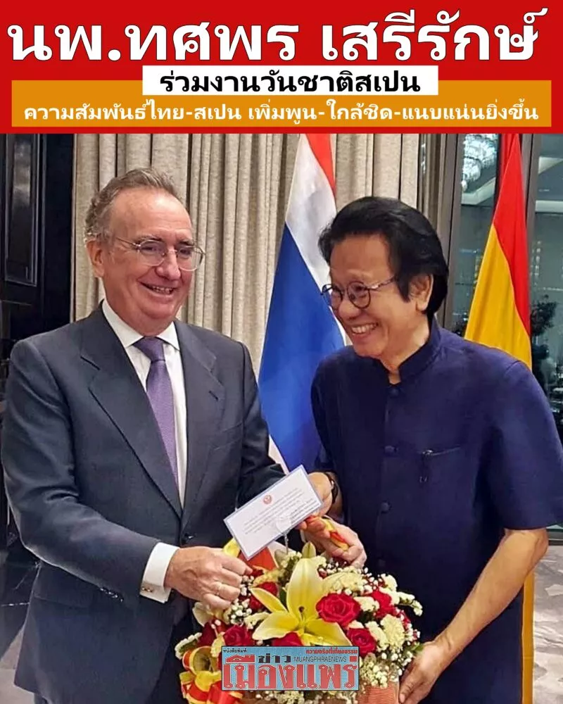 การเมืองสังคม นพ.ทศพร เสรีรักษ์ สส.แพร่ เขต 1 พรรคเพื่อไทย ร่วมงานวันชาติสเปน เผย ความสัมพันธ์ไทย-สเปน 155 ปี มีแต่เพิ่มพูน–ใกล้ชิด และแนบแน่น มากยิ่งขึ้น ตุลาคม 14, 2025 admin Facebook iconFacebookLINE iconLine Post Views: 191 นพ.ทศพร เสรีรักษ์ สส.จังหวัดแพร่ พรรคเพื่อไทย กรรมการบริหารกลุ่มมิตรภาพสมาชิกรัฐสภาไทย-สเปน เข้าร่วมแสดงความยินดีในงานวันชาติราชอาณาจักรสเปน เผย 155 ปี เผยความสัมพันธ์สองประเทศ มีแต่พิ่มพูน ใกล้ชิด และแนบแน่นมากยิ่งขึ้น อีกทั้งมีความร่วมมือที่ใกล้ชิดในเวทีระหว่างประเทศ เมื่อวันศุกร์ที่ 10 ตุลาคม 2568 เวลา 18.30 นาฬิกา ณ โรงแรม The Ritz-Carlton ชั้น 4 เขตปทุมวัน กรุงเทพมหานคร นายทศพร เสรีรักษ์ สส.จังหวัดแพร่ พรรคเพื่อไทย ในฐานะกรรมการบริหารกลุ่มมิตรภาพสมาชิกรัฐสภาไทย-สเปน เข้าร่วมแสดงความยินดีในงานวันชาติราชอาณาจักรสเปน โดยมี นายเฟลิเป เด ลา โมเรนา กาซาโด (H.E. Mr. Felipe de la Morena Casado) เอกอัครราชทูตราช อาณาจักรสเปนประจำประเทศไทย และคณะ ให้การต้อนรับ นายแพทย์ทศพร กล่าวว่า ไทยและสเปนสถาปนาความสัมพันธ์ทางการทูตระหว่างกันเมื่อวันที่ 23 กุมภาพันธ์ 2413 (นับจนถึงปัจจุบัน 155 ปี) โดยทั้งสองประเทศได้ลงนามในสนธิสัญญาทางไมตรี การค้าขาย และการเดินเรือระหว่างราชอาณาจักรสยามกับราชอาณาจักรสเปน ปัจจุบัน ความสัมพันธ์ได้เพิ่มพูนและครอบคลุมหลากหลายมิติ ทั้งด้านการค้า การลงทุน การท่องเที่ยว การศึกษา วิทยาศาสตร์ เทคโนโลยีและนวัตกรรม ตลอดจนการท่องเที่ยวและวัฒนธรรม โดยมีโรงเรียนมัธยมและมหาวิทยาลัยของไทยหลายแห่งเปิดการเรียนการสอนภาษาสเปน นอกจากนี้ ทั้งสองฝ่ายยังมีความร่วมมือที่ใกล้ชิดในเวทีระหว่างประเทศ อาทิ สหประชาชาติ สหภาพยุโรป และกรอบการประชุมเอเชีย – ยุโรปด้วย