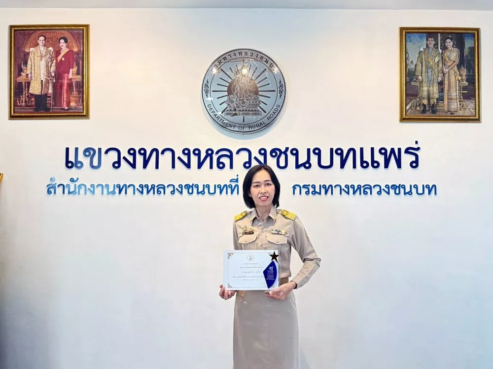 วันที่ 21 สิงหาคม 2568 นายอกนิษฐ์ อรุณพิทักษ์พันธ์ ผู้อำนวยการแขวงทางหลวงชนบทแพร่มอบโล่และเกียรติบัตร พนักงานราชการดีเด่น ประจำปี พ.ศ. 2567 ของกรมทางหลวงชนบทให้แก่ น.ส.จุฬารัตน์ ดวงใน เจ้าพนักงานธุรการ (พร.) พร้อมทั้ง
