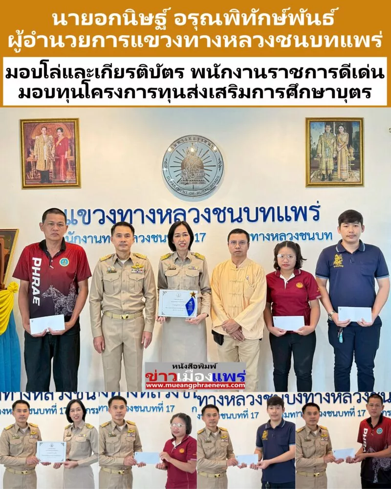 นายอกนิษฐ์ อรุณพิทักษ์พันธ์ ผู้อำนวยการแขวงทางหลวงชนบทแพร่ มอบโล่และเกียรติบัตร พนักงานราชการดีเด่น ประจำปี 2567 มอบทุนโครงการทุนส่งเสริมการศึกษาบุตร ประจำปี 2568