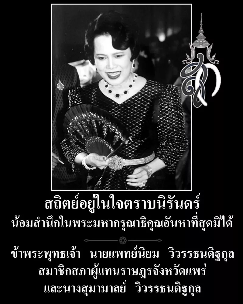 สถิตอยู่ในใจตราบนิรันดร์ น้อมสำนึกในพระมหากรุณาธิคุณอันหาที่สุดมิได้และร่วมถวายความอาลัย สมเด็จพระนางเจ้าสิริกิติ์ พระบรมราชินีนาถ พระบรมราชชนนีพันปีหลวง ข้าพระพุทธเจ้า นายแพทย์นิยม วิวรรธนดิฐกุล สมาชิกสภาผู้แทนราษฎรจังหวัดแพร่ และนางสุมามาลย์ วิวรรธนดิฐกุล