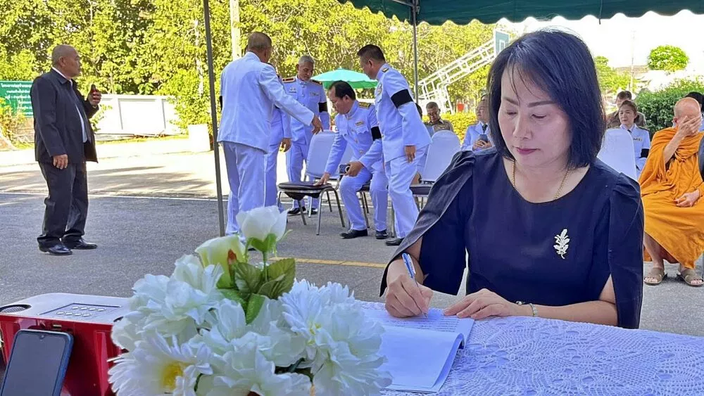 นายเอกชัย หงส์อ้าย นายกเทศมนตรีตำบลวังหงส์ ประธานในพิธีถวายสักการะและพิธีสรงน้ำพระบรมศพ เบื้องหน้าพระฉายาลักษณ์สมเด็จพระนางเจ้าสิริกิติ์ พระบรมราชินีนาถ พระบรมราชชนนีพันปีหลวง พร้อมลงนามแสดงความไว้อาลัย