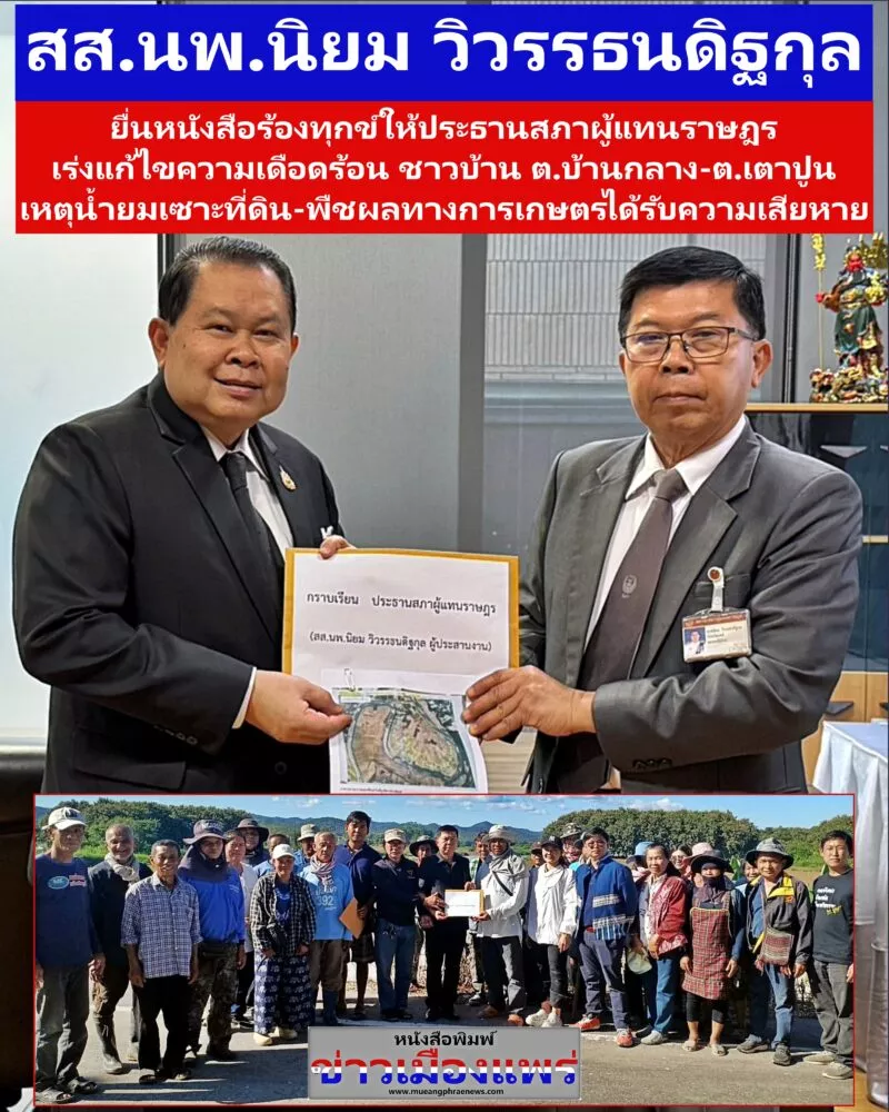 ผู้สื่อข่าวรายงานว่า เมื่อวันที่ 29 ตุลาคม 2568 สส.นายแพทย์นิยม วิวรรธนดิฐกุล สส.แพร่เขต 2 พรรคเพื่อไทยได้ยื่นหนังสือร้องทุกข์ของชาวบ้าน ต.บ้านกลาง และ ต.เตาปูน อ.สอง จ.แพร่ ต่อประธานสภาผู้แทนราษฎร โดยมีนายไชยาพรหมมา รองประธานสภาราษฎร เป็นตัวแทนประธานสภาผู้แทนราษฎร มารับหนังสือร้องทุกข์ดังกล่าว