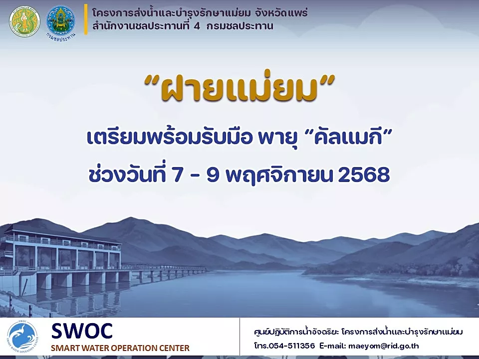 พร้อมทั้งให้เจ้าหน้าที่ในสังกัด โครงการส่งน้ำและบำรุงรักษาแม่ยม และ “ฝายแม่ยม” เตรียมพร้อมรับมือพายุ”คัลแมกี” ช่วงระหว่างวันที่ 7-9 พฤศจิกายน 2568