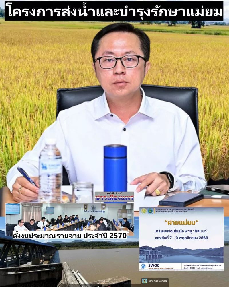 นายไชยวัฒน์ กำทอง ผู้อำนวยการโครงการส่งน้ำและบำรุงรักษาแม่ยม ร่วมประชุมแผนงานขอตั้งงบประมาณรายจ่าย ประจำปี 2570 ณ สำนักงานชลประทานที่ 4 กรมชลประทาน และให้เจ้าหน้าที่ในสังกัด “โครงการส่งน้ำและบำรุงรักษาแม่ยม” และ “ฝายแม่ยม” เตรียมพร้อมรับมือพายุ “คัลแมกี” ช่วงวันที่ 7-9 พฤศจิกายน 2568