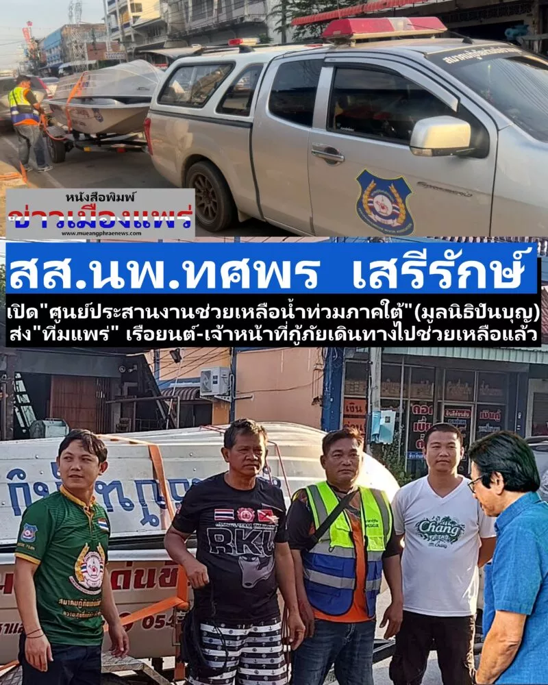 เมื่อวันที่ 26 พฤศจิกายน 2568 นายแพทย์ทศพร เสรีรักษ์ สมาชิกสภาผู้แทนราษฎรจังหวัดแพร่ ได้แสดงความเป็นห่วงใยต่อสถานการณ์อุทกภัยในพื้นที่ภาคใต้ที่เกิดขึ้นอย่างอย่างต่อเนื่อง โดยได้เปิด “ศูนย์ประสานงานช่วยเหลือน้ำท่วมภาคใต้”(มูลนิธิปันบุญ) และ เมื่อ25 พฤศจิกายน 2568 ได้ดำเนินการจัดส่ง เรือยนต์ เพื่อเข้าร่วมสนับสนุนภารกิจช่วยเหลือและบรรเทาทุกข์แก่พี่น้องประชาชนที่ได้รับผลกระทบจากน้ำท่วมในพื้นที่ภาคใต้เป็นการเร่งด่วน ทั้งนี้ทีมแพร่ ชุดที่เดินทางไปช่วยเหลือประกอบด้วย “มูลนิธิกู้ภัยเด่นชัยร่วมบุญ” และ”มูลนิธิปันบุญ” รวมเจ้าหน้าที่ 6 คน เรือท้องแบน 2 ลำ และเจ็ตสกี 1 ลำ ได้ออกเดินทางจากจังหวัดแพร่ไปแล้ว