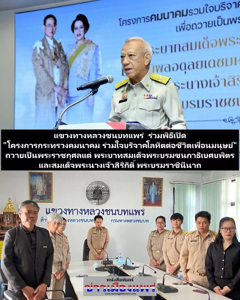 นายอกนิษฐ์ อรุณพิทักษ์พันธ์ ผู้อำนวยการแขวงทางหลวงชนบทแพร่ พร้อมด้วยข้าราชการ พนักงานราชการ และเจ้าหน้าที่ในสังกัด ร่วมพิธีเปิด “โครงการกระทรวงคมนาคม ร่วมใจบริจาคโลหิตต่อชีวิตเพื่อนมนุษย์” ถวายเป็นพระราชกุศลแด่ พระบาทสมเด็จพระบรมชนกาธิเบศบพิตร และสมเด็จพระนางเจ้าสิริกิติ์ พระบรมราชินีนาถ พระบรมราชชนนีพันปีหลวง และร่วมพิธีบำเพ็ญกุศลครบ 50 วัน (ปัญญาสมวาร) แห่งการสวรรคต ถวายพระราชกุศล สมเด็จพระนางเจ้าสิริกิติ์ พระบรมราชินีนาถ พระบรมราชชนนีพันปีหลวง และร่วมพิธีเจริญพระพุทธมนต์และพิธีทำบุญตักบาตรถวายพระราชกุศลเฉลิมพระเกียรติวันคล้ายวันประสูดิ สมเด็จพระเจ้าลูกเธอเจ้าฟ้าพัชรกิติยาภานเรนทิราเทพยวดี กรมหลวงราชสาริณีสิริพัชรมหาวัชรราชธิดา