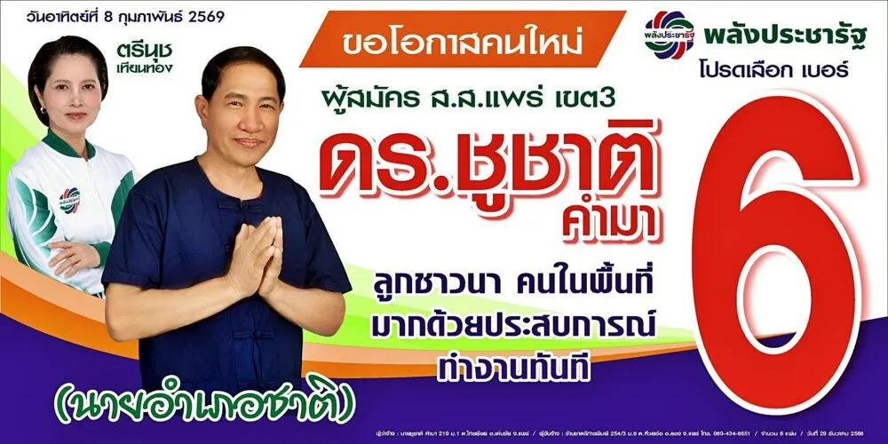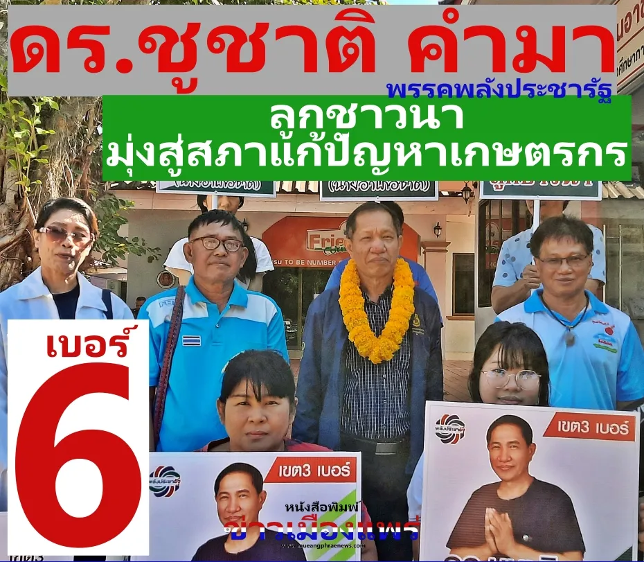 ดร.ชูชาติ คำมา ลูกชาวนาแท้ พร้อมอาสารับใช้พัฒนาพี่น้องประชาชนในพื้นที่เขตเลือกตั้งที่สาม เพื่อเข้าไปประสานการแก้ไขปัญหาความยากจนของพี่น้องเกษตรกรในพื้นที่ วันที่ 8 กุมพาพันธ์ 2568 เข้าคูหาโปรดพิจารณาเลือก ดร.ชูชาติ คำมา เบอร์ 6 พรรพลังประชารัฐ