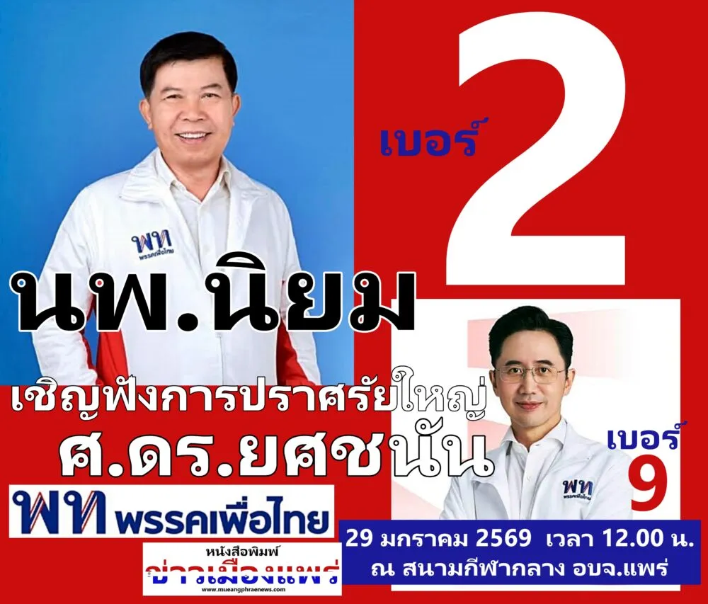นพ.นิยม เบอร์ 2 พรรคเพื่อไทย เชิญฟังการปราศรัยใหญ่ โดย ศ.ดร.ยศชนัน วงศ์สวัสดิ์ วันที่ 29 มค.69 เวลา 12.00 น. ณ อบจ.แพร่