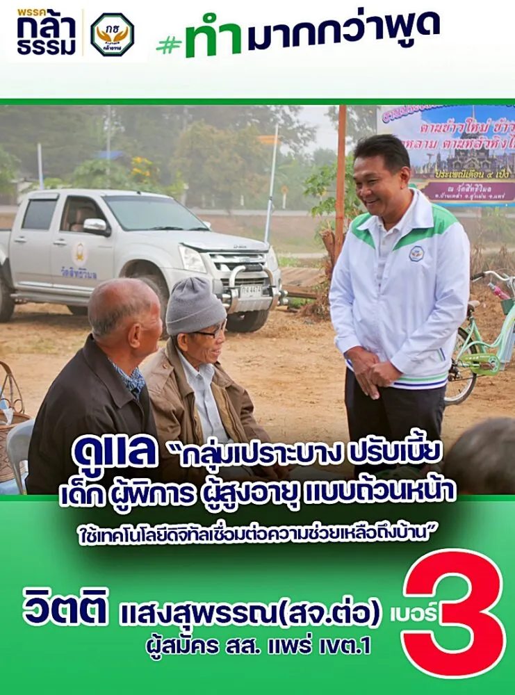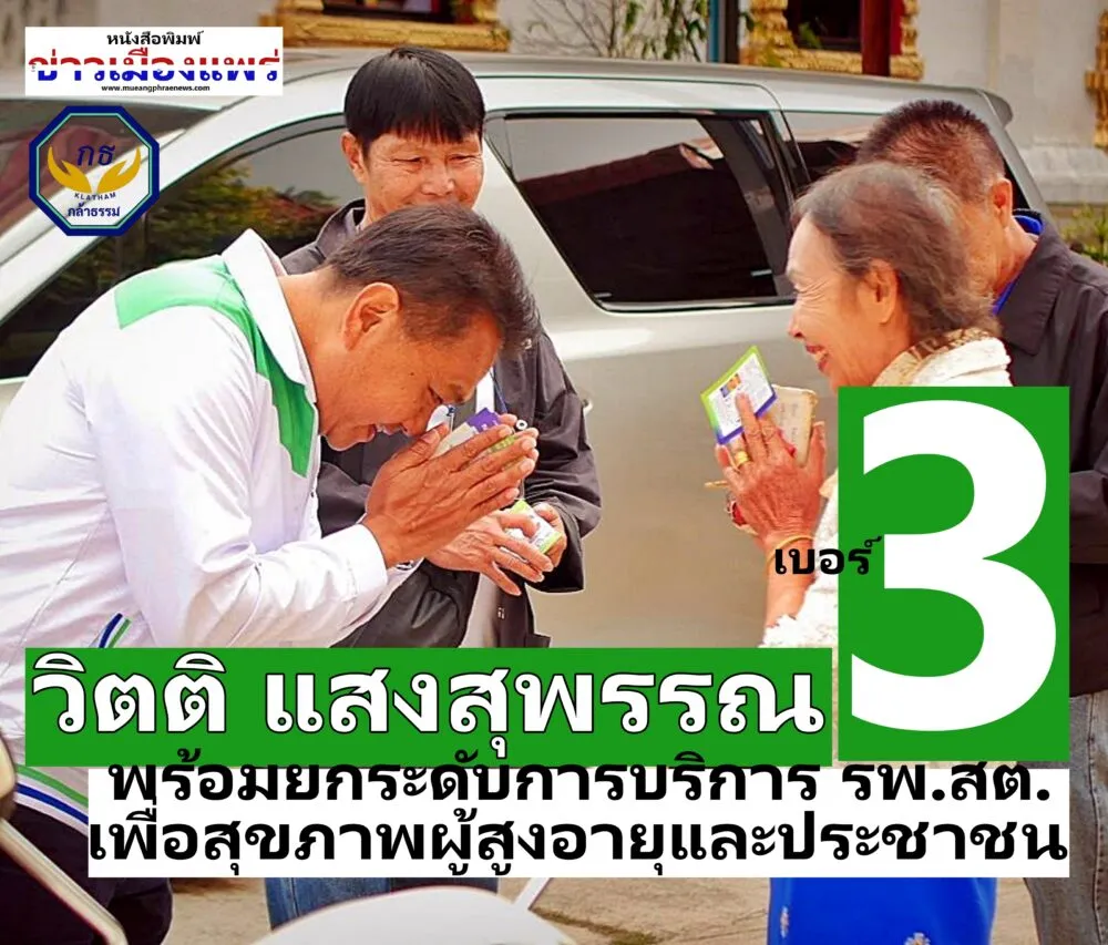 นายวิตติ แสงสุพรรณ เบอร์ 3 ผู้สมัคร สส.แพร่ พรรคกล้าธรรม เขตหนึ่ง ขออาสาต่อยอดยกระดับการบริการ รพ.สต.เพื่อผู้สูงอายุ และพี่น้องประชาชนในชุมชนด้วยการประสานงบประมาณให้ท้องถิ่น ดำเนินการ ในตำแหน่ง สส.แพร่ เขตหนึ่ง