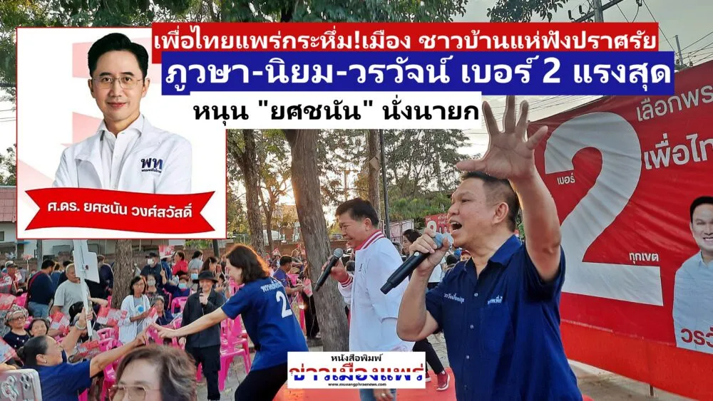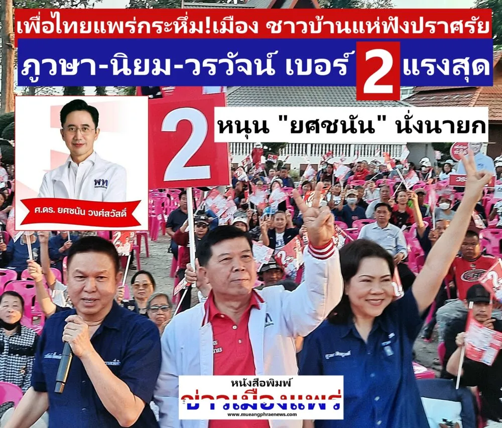 “เพื่อไทยแพร่”กระหึ่ม!เมือง ชาวบ้านแห่ฟังปราศรัย ภูวษา-นิยม-วรวัจน์ ยกทีมเบอร์ 2 แรงสุด พร้อมหนุน “ยศชนัน” เบอร์ 9 นั่งนายกรัฐมนตรี