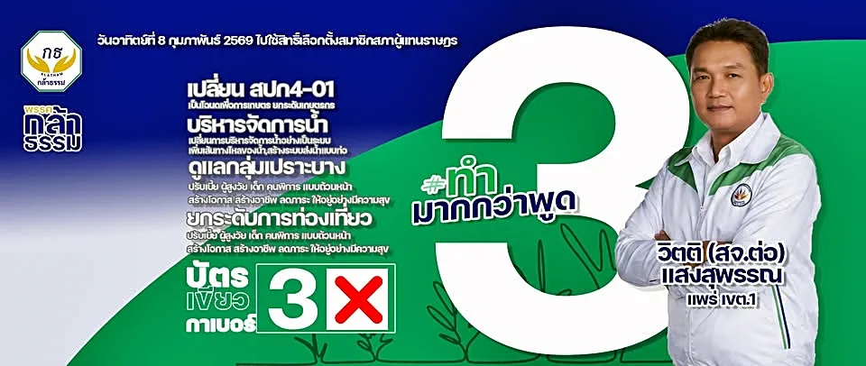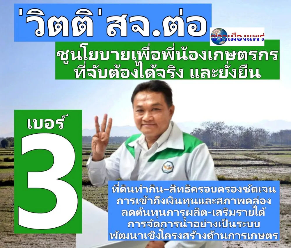 “วิตติ”สจ.ต่อ เบอร์ 3 พรรคกล้าธรรม ตะลุยหาหาเสียงโค้งสุดท้าย ชูนโยบายเอาใจเพื่อพี่น้องเกษตรกร ที่จับต้องได้จริง ไม่ขายฝัน และมีความยั่งยืน อาทิ ที่ดินทำกิน – สิทธิครอบครองชัดเจน การเข้าถึงเงินทุนและสภาพคล่อง ลดต้นทุนการผลิต–เสริมรายได้ การจัดการน้ำอย่างเป็นระบบ และพัฒนาเชิงโครงสร้างด้านการเกษตรเพื่อความยั่งยืน