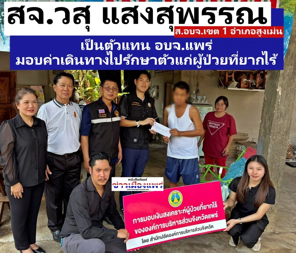 สจ.วสุ แสงสุพรรณ ส.อบจ.เขต 1 อำเภอสูงเม่น เป็นตัวแทน อบจ.แพร่ มอบเงินทุนสงเคราะห์ให้แก่ผู้ป่วยยากไร้เพื่อใช้เป็นค่าเดินทางไปรักษารักษาตัว
