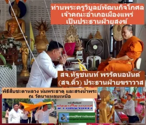เมื่อวันที่ 16 เมษายน 2569 สจ.ทัฐชนนท์ พรรัตนอนันต์ (สจ.ติ๋ว) สมาชิกสภาองค์การบริหารส่วนจังหวัดแพร่ เขตอำเภอเมืองแพร่ ได้เป็นประธานฝ่ายฆราวาส ร่วมพิธีสืบชะตาหลวง ห่มพระธาตุ และสรงน้ำพระ ณ วัดนาแหลมเหนือ ต.ทุ่งกวาว อ.แพร่ จ.แพร่ เพื่อความเป็นสิริมงคลต่อตนเอง ครอบครัว และพี่น้องประชาชน เนื่องในเทศกาลสงกรานต์หรือประเพณีปี๋ใหม่เมือง โดย ท่านพระครูวิบูลย์พัฒนกิจโกศล เจ้าคณะอำเภอเมืองแพร่ เป็นประธานฝ่ายสงฆ์