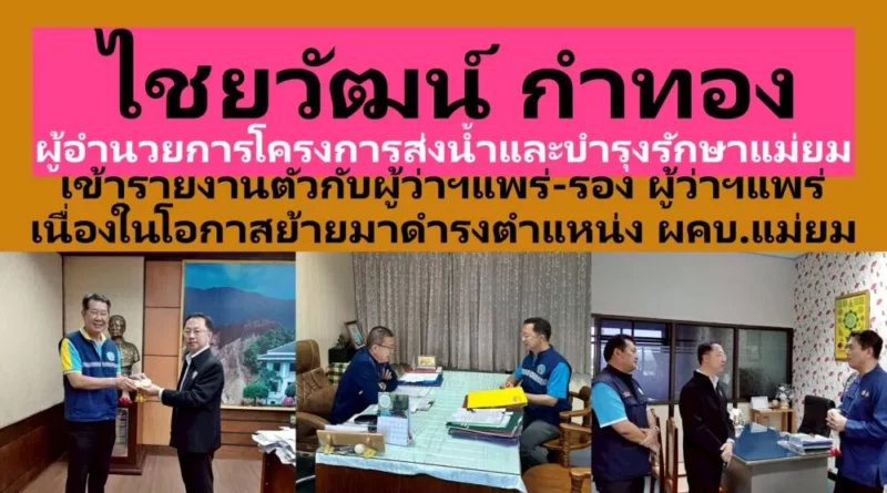 นายไชยวัฒน์ กำทอง ผู้อำนวยการโครงการส่งน้ำและบำรุงรักษาแม่ยม  เข้ารายงานตัวกับผู้ว่าฯ-รอง ผู้ว่าฯแพร่ เนื่องในโอกาสย้ายมารับตำแหน่งใหม่
